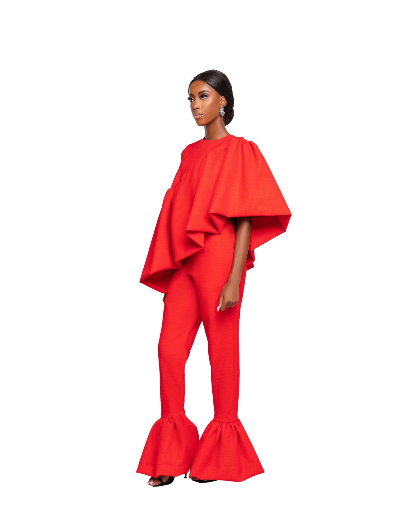 Drenched in fiery red, this ensemble is crafted for the woman who enters a room and owns it.