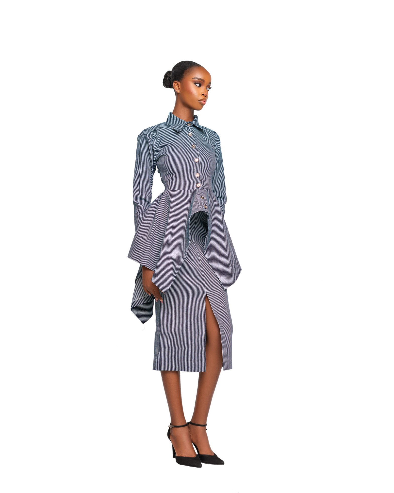 Button-down, collared blouse tailored to accentuate the waist, featuring an exaggerated asymmetric peplum that adds drama and sophistication to the silhouette. -