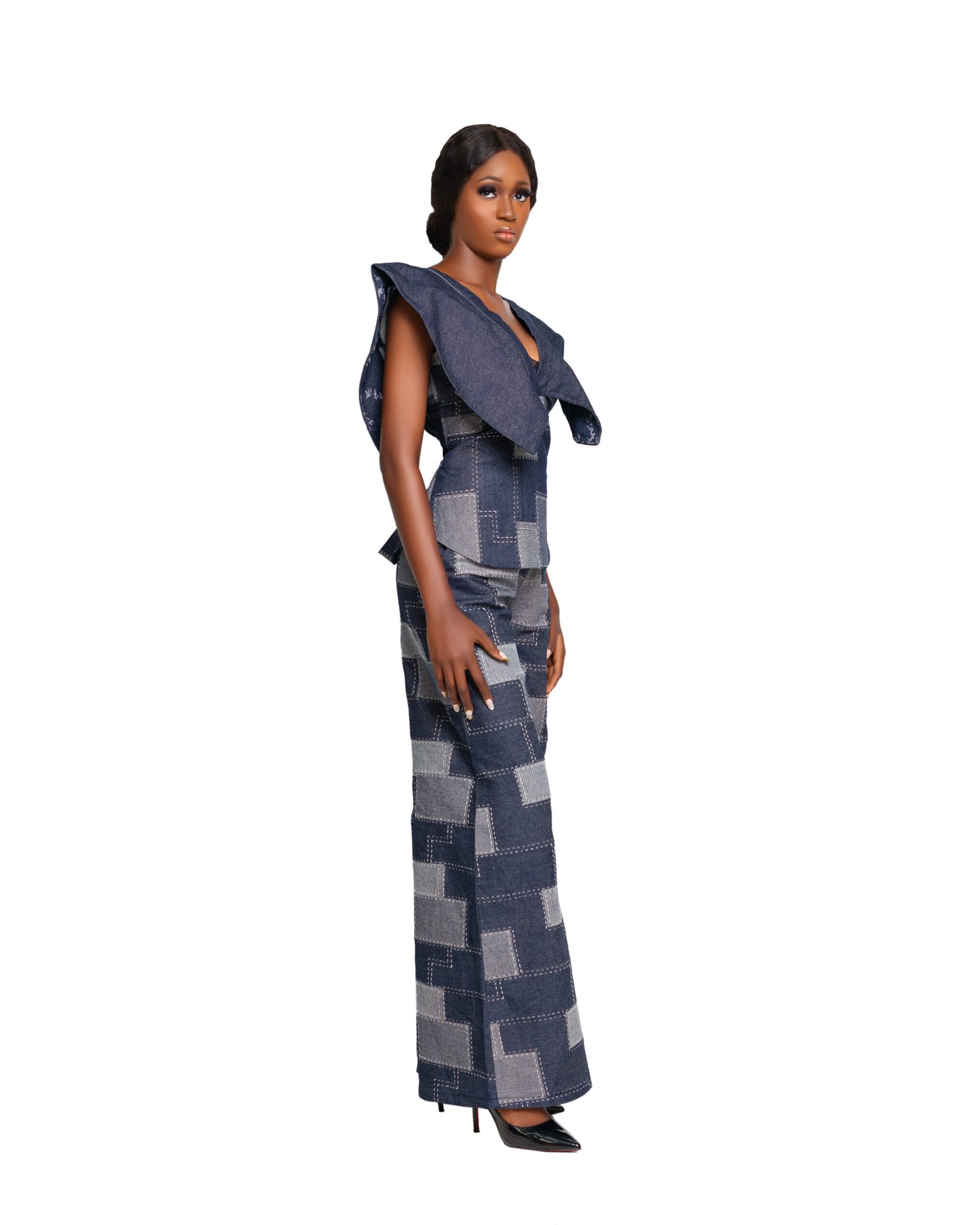 With its architectural neckline and geometric patchwork print, this set is a perfect fusion of tradition, texture, and modern tailoring.